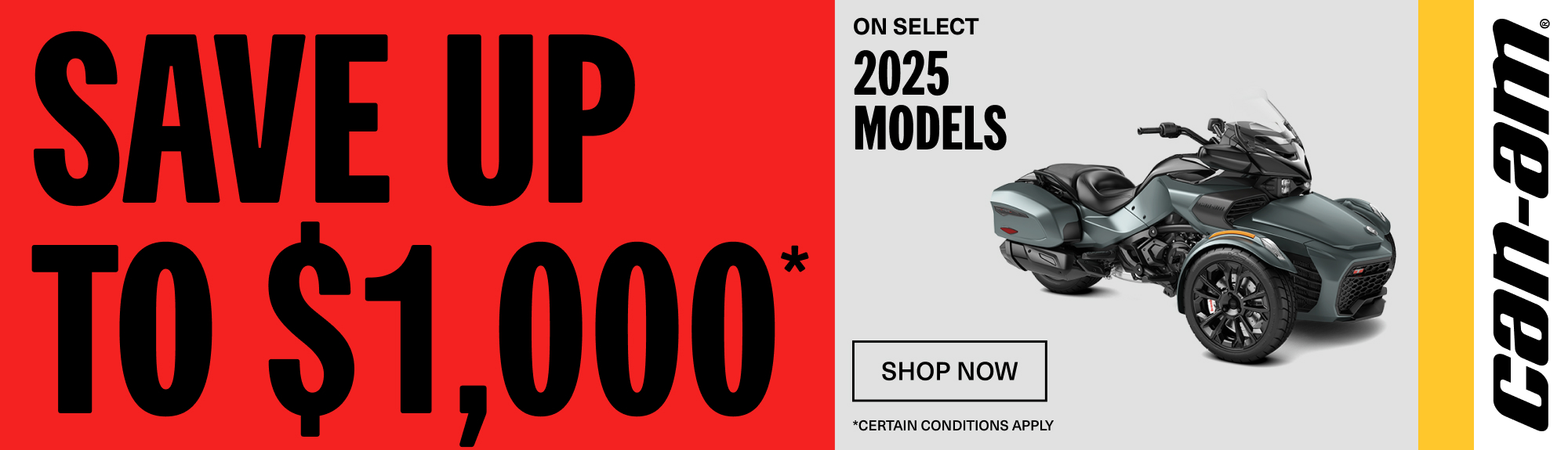 † Get up to a $1,000 rebate on select 2025 Can-Am models: Consumers who purchase a Can-Am Spyder or a Can-Am Canyon model during the promotional period are eligible to a $1,000 rebate. Consumers hwo purchase a Can-Am Ryker during the promotional period are eligible to a $750 rebate.