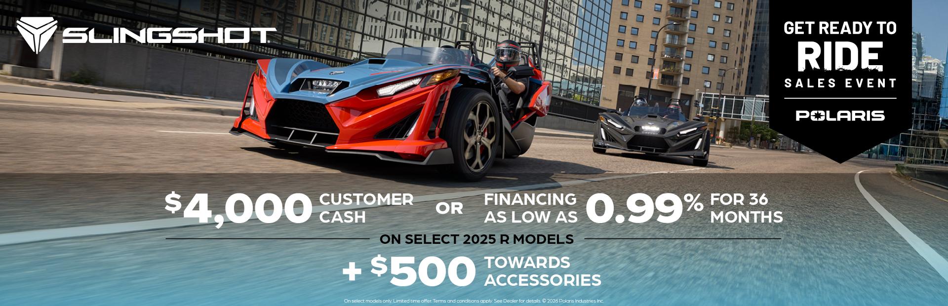 **2025 Model Year Slingshot Family (excluding Slingshot 10) 0.99% APR for 36 Months and $0 Down This is a limited time offer which is valid for the purchase of selected qualifying models and is subject to credit approval on qualified purchases financed during this program. Offer may not be combined with certain other offers, is subject to change and may be extended or terminated without further notice. Offer valid on new 2025 Slingshot® models (excluding Slingshot 10). Monthly payment and cost of borrowing will vary depending on amount borrowed and down payment/trade. Minimum amount to finance is $5,000. Example: $28,299 financed at 0.99% APR over 36 months = 36 monthly payments of $718; financed amount of $25,469 with $2,830 down payment, total cost of borrowing of $390 and a total obligation of $25,860. An example of monthly payments required on a 36-month term at 0.99% APR is $28.20 per $1,000 financed. Monthly payment examples assume 10% down and do not include taxes, title, and other fees. Offer only valid to qualified customers, not all customers will qualify, other offers available, see dealer for details. Offer Valid: March 1 – 31, 2026.